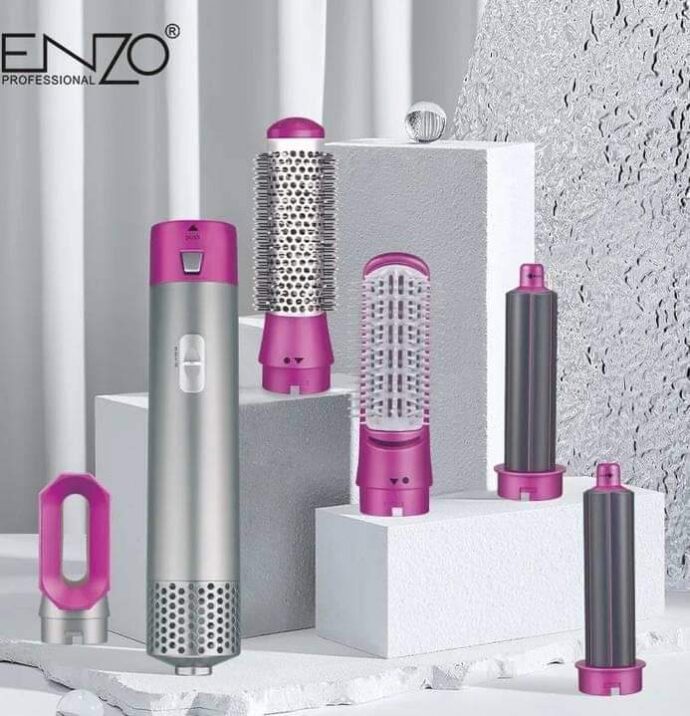 استمتعي بأداء احترافي في منزلك مع جهاز ENZO 5-in-1 متعدد الوظائف لتجفيف، تمليس، تجعيد، وتصفيف الشعر بكل سهولة وفعالية. يأتي الجهاز مع 5 رؤوس قابلة للتبديل لتناسب كل احتياجات شعرك، سواء كنتِ تبحثين عن تموجات ناعمة، تجعيدات كثيفة، شعر أملس، أو حتى تجفيف سريع.